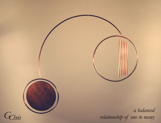 Sculpture: a balanced relationship of one to many, 2′ x 1′, wood and metal mobile