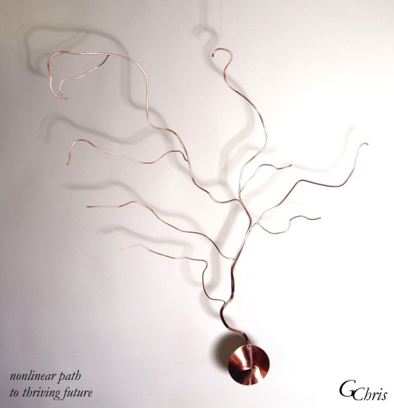 Sculpture: nonlinear path to thriving future (river), 3′ x 3′, metal mobile