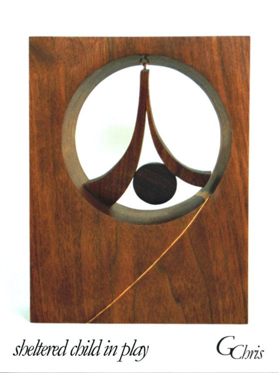 Sculpture: sheltered child in play, 1′ x 1′, wood and metal stabile