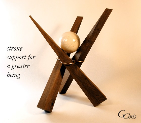 Sculpture – save the world, complex, 1′ x 1′, wood and metal stabile