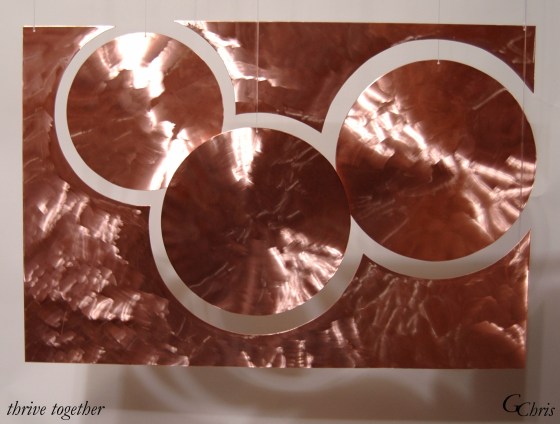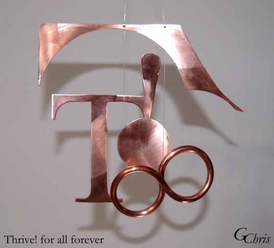Sculpture: Thrive! for all forever, 1′ x 1′, metal mobile