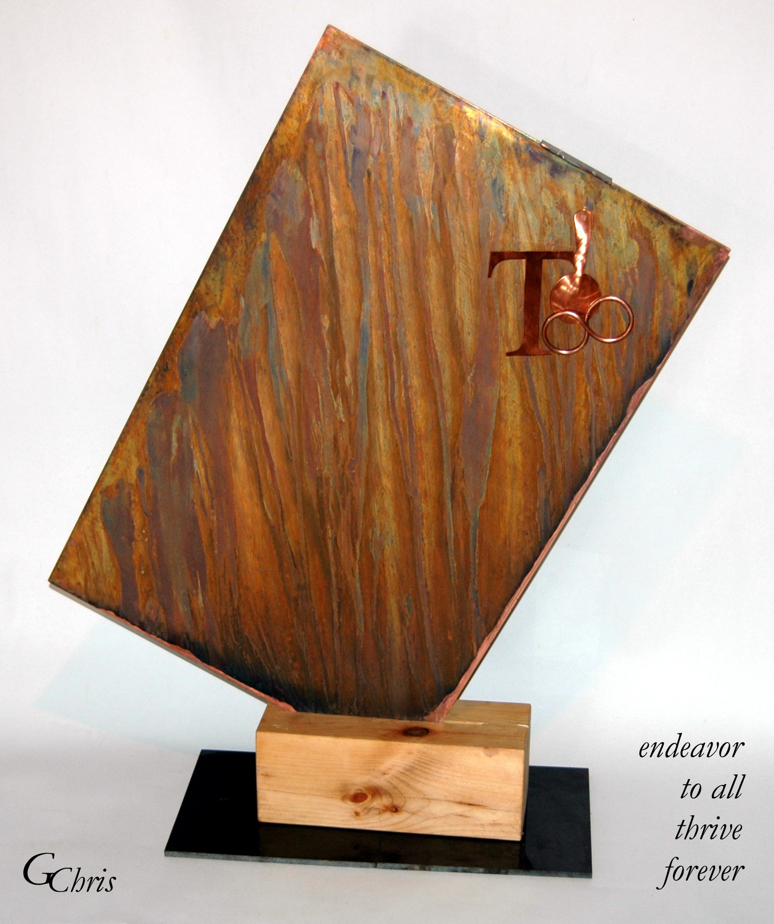 Sculpture: endeavor to all thrive forever, 2′ x 3′, metal and wood stabile