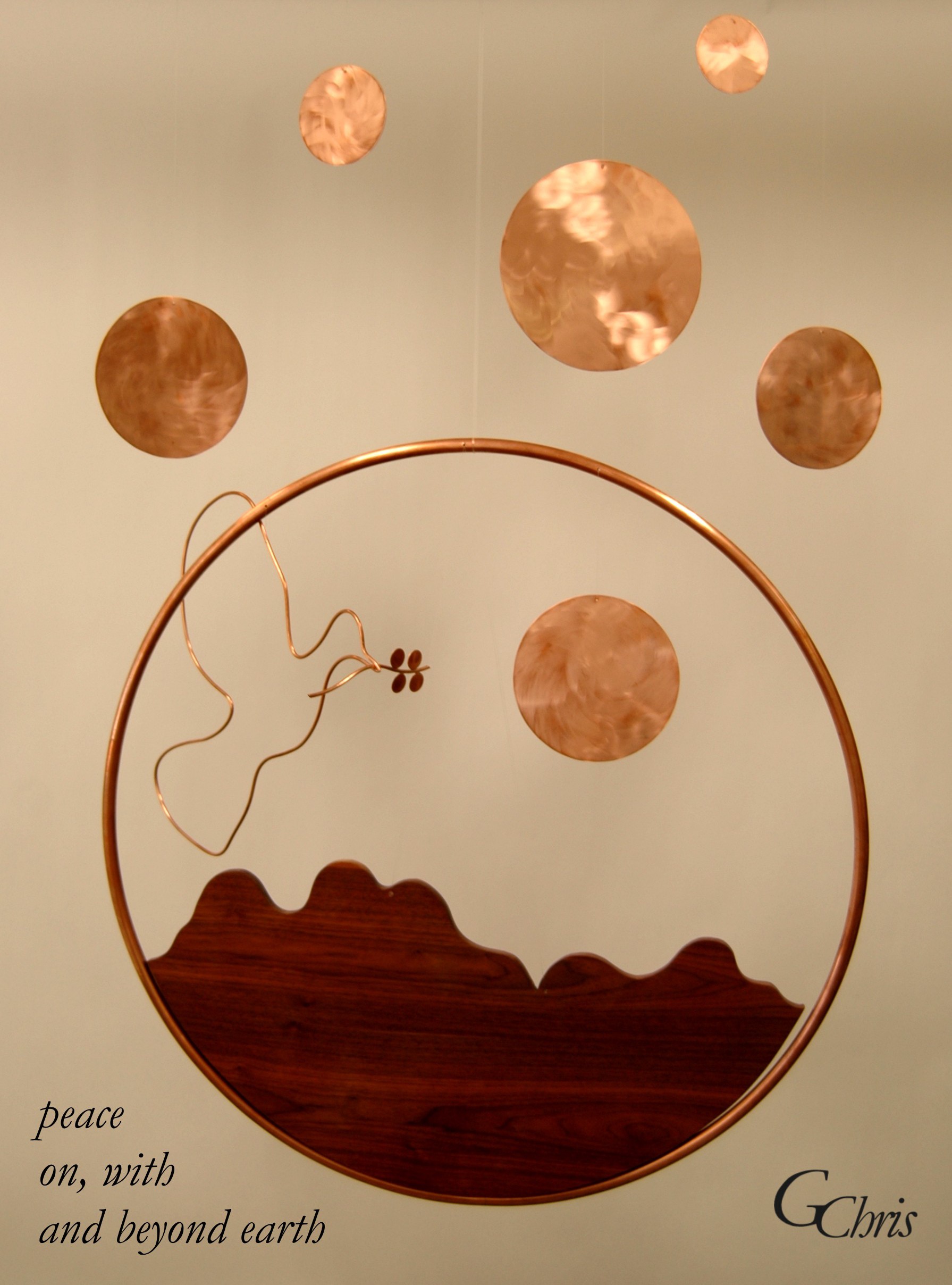 Sculpture: peace on, with and beyond earth, 4′ x 5′, wood and metal mobile