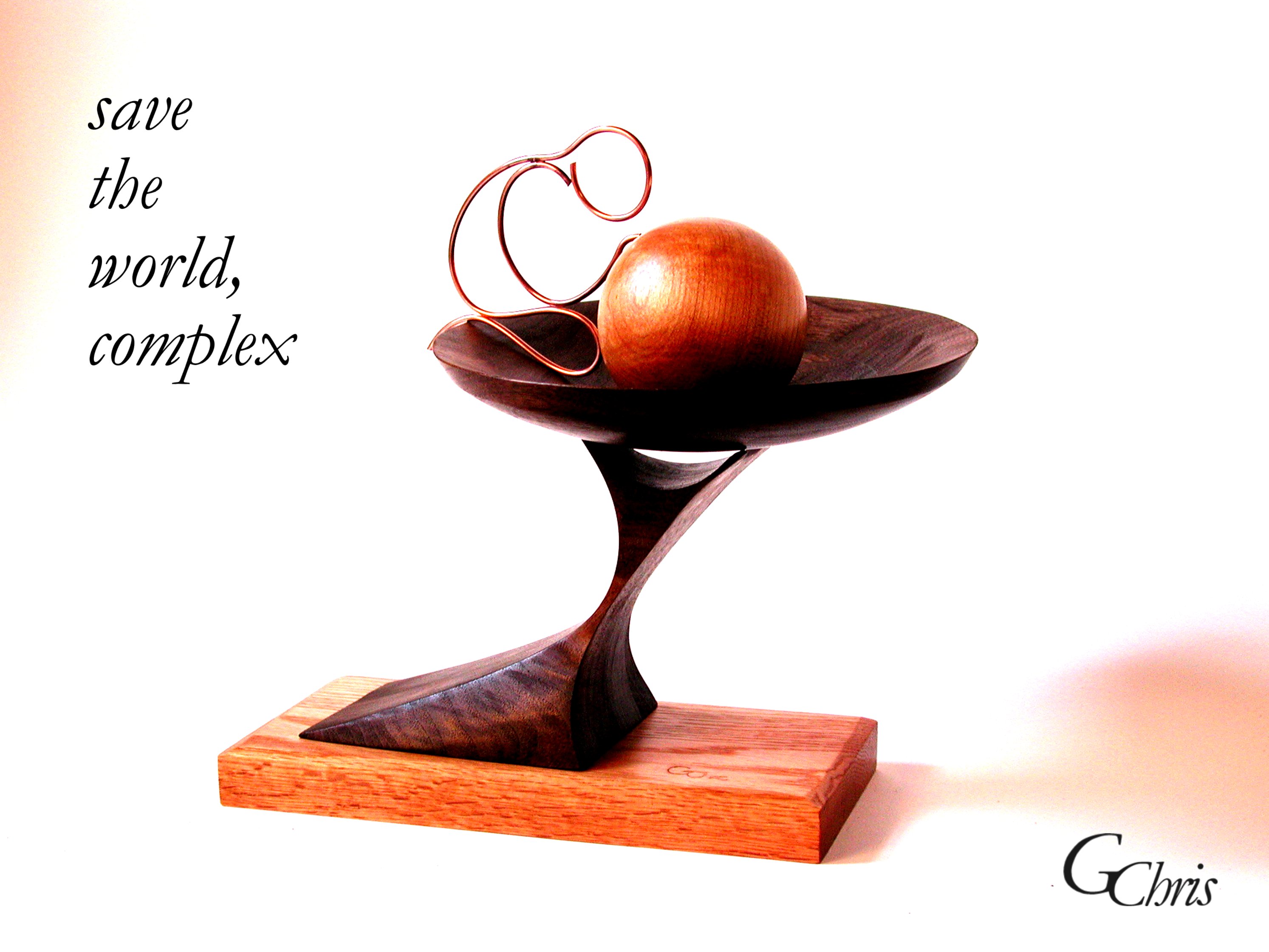 Sculpture – save the world, complex, 1′ x 1′, wood and metal stabile